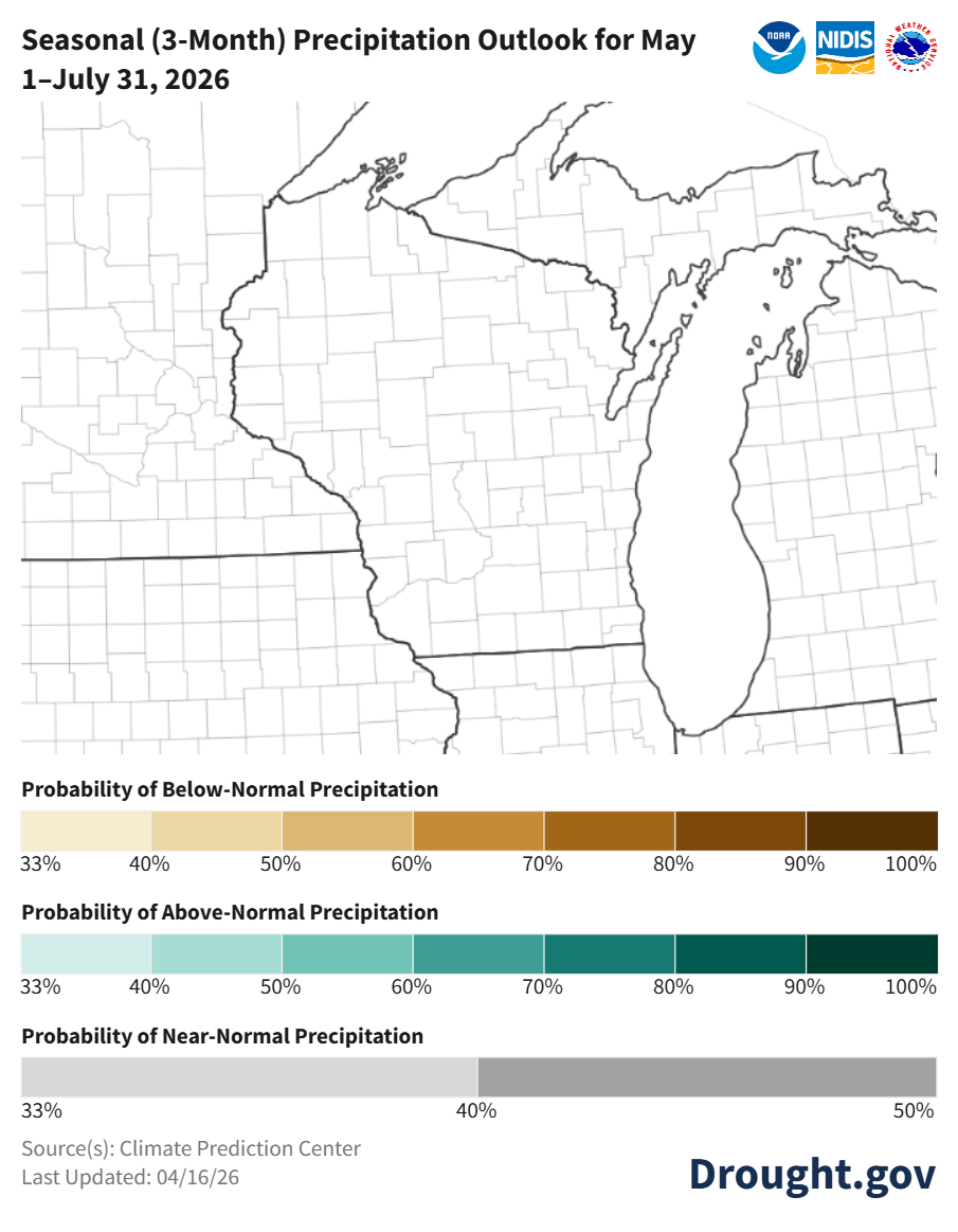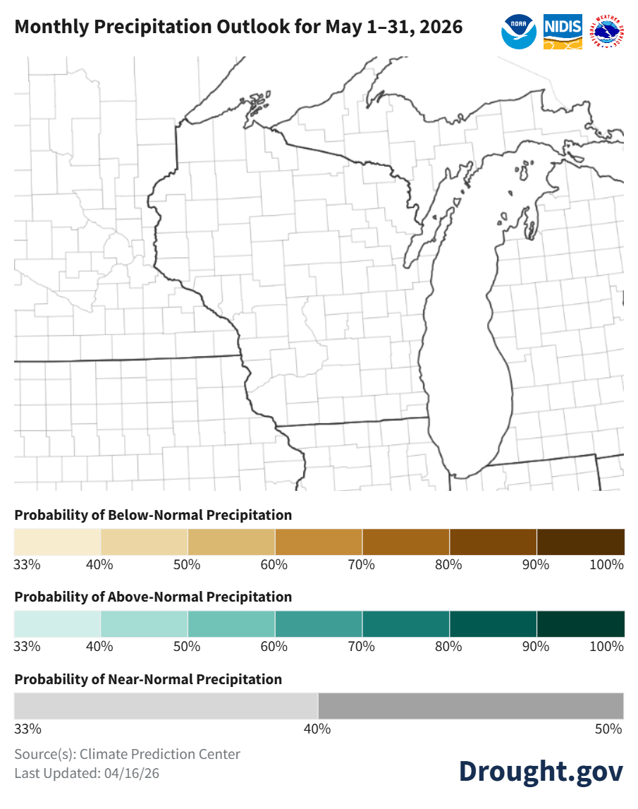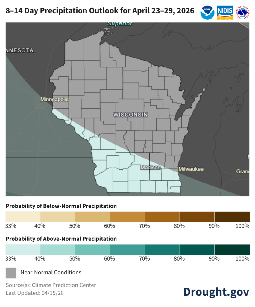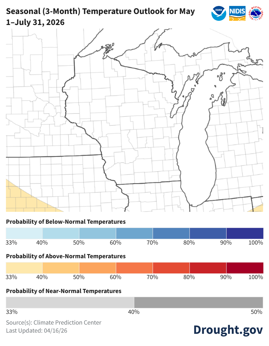 - Climate probabilities for late April indicate near normal temperatures and precipitation for most of Wisconsin. Southern and far western counties are leaning toward above normal precipitation (33-40% odds).