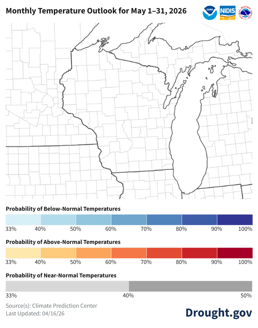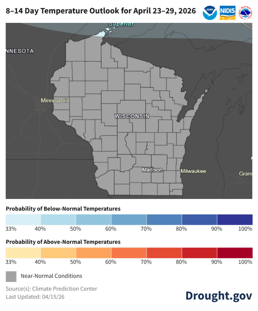 - Late April: temperature probabilities are leaning towards near normal statewide, with precipitation leaning towards near normal for most of Wisconsin. Southern and far western counties are leaning toward above normal precipitation (33-40% odds).