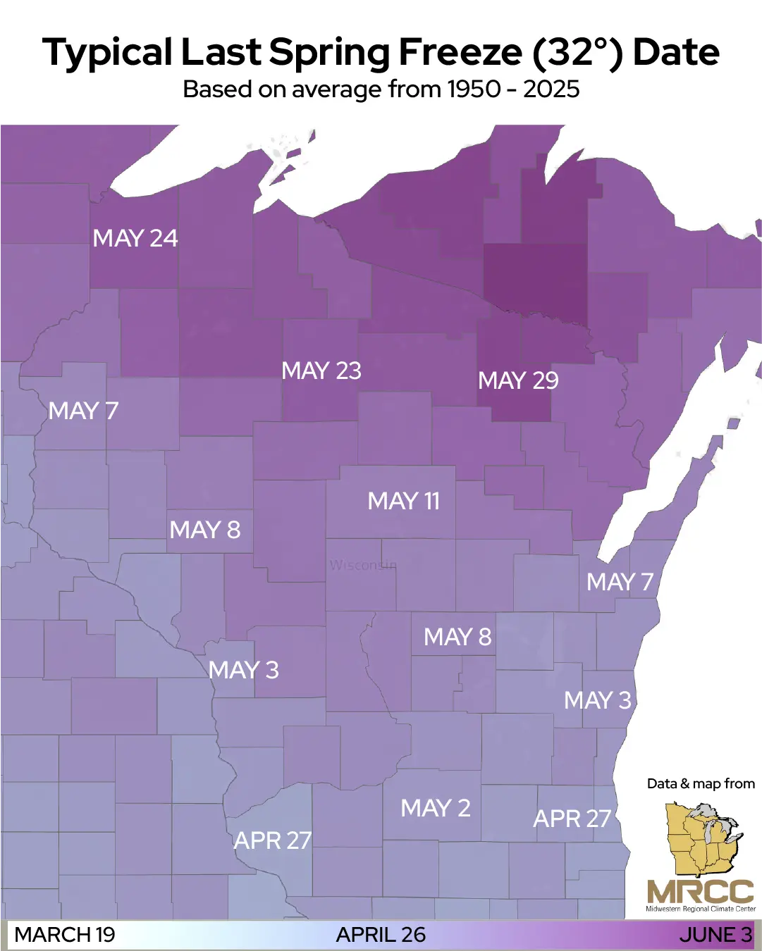 The map is titled “Typical Last Spring Freeze (32°) Date” with a subtitle stating it is based on averages from 1950–2025. It shows Wisconsin divided by counties, shaded in a purple gradient indicating the average date of the last 32°F spring freeze. Dates are labeled across the state. Southern Wisconsin shows earlier last freeze dates, mainly late April (for example, April 26–27 and May 2–3). Central Wisconsin shows early to mid‑May dates, such as May 7, May 8, and May 11. Northern Wisconsin, including areas near Lake Superior, shows later dates from mid‑ to late May, including May 23, May 24, and May 29. A color bar at the bottom indicates a progression from March 19 on the early end to June 3 on the late end. The Midwestern Regional Climate Center (MRCC) logo and a small Wisconsin locator map appear at the lower right.