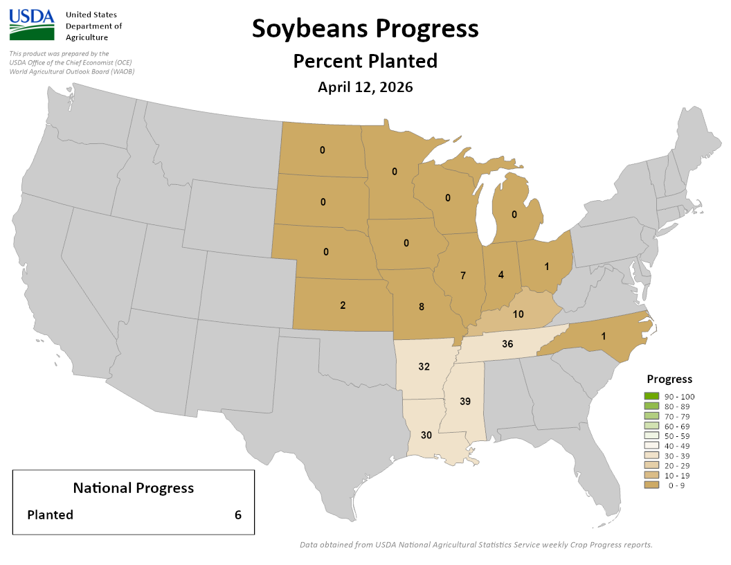 The image is titled “Soybeans Progress – Percent Planted, April 12, 2026” and is produced by the United States Department of Agriculture. It shows a U.S. map with states shaded by soybean planting progress. A legend on the right indicates percentage ranges from 0–9% (tan) to 90–100% (dark green). Numeric percentages appear inside many states. Southern states show the most progress: Louisiana is labeled 39%, Arkansas 32%, Mississippi 30%, and Tennessee 36%. Kentucky shows 10%, Missouri 8%, and Illinois 7%. Several Midwest and Northern Plains states, including Wisconsin, Minnesota, North Dakota, South Dakota, Michigan, and Ohio, show 0–1% planted or are in the lowest category. A box at the lower left reads “National Progress: Planted 6.” Gray states indicate little or no reported progress. Small text at the bottom cites USDA National Agricultural Statistics Service weekly Crop Progress reports.