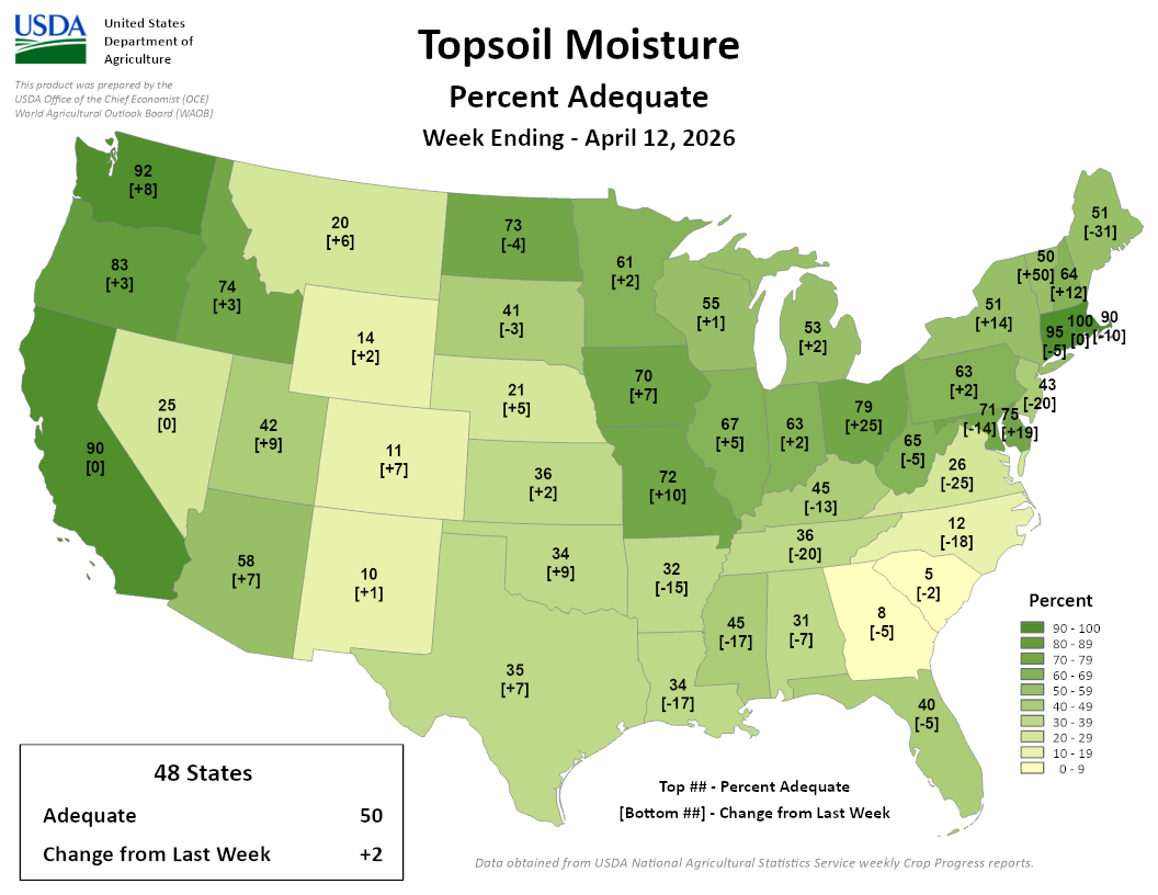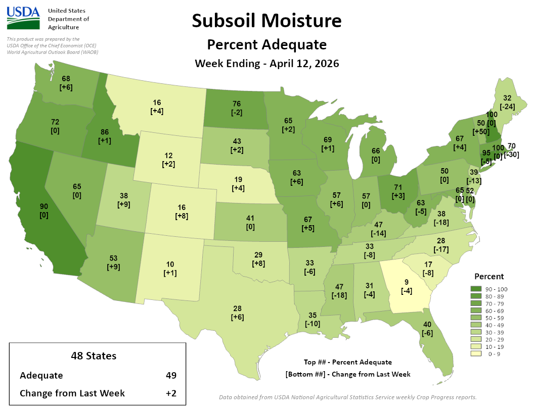 - 55-70% of agricultural soils in the state are reported as having adequate topsoil and subsoil moisture.