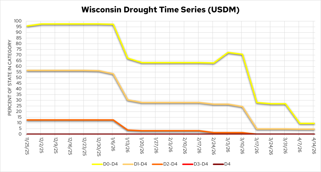 The graphic titles read “Wisconsin Drought Time Series (USDM).” Two identical charts are shown. The horizontal axis lists weekly dates from November 25, 2025, through April 14, 2026. The vertical axis shows percent of Wisconsin in each drought category (0–100%). Lines represent drought categories: D0–D4 (yellow), D1–D4 (light orange), D2–D4 (orange), D3–D4 (red), and D4 (dark red).