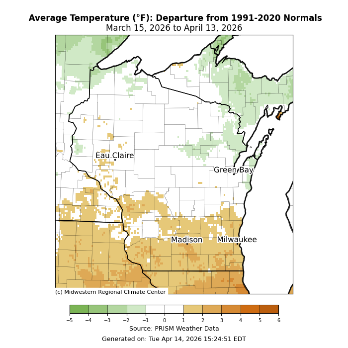 - Temperatures were 2-4°F above normal across southern Wisconsin. Further to the north, temperatures were commonly within 1°F of normal.