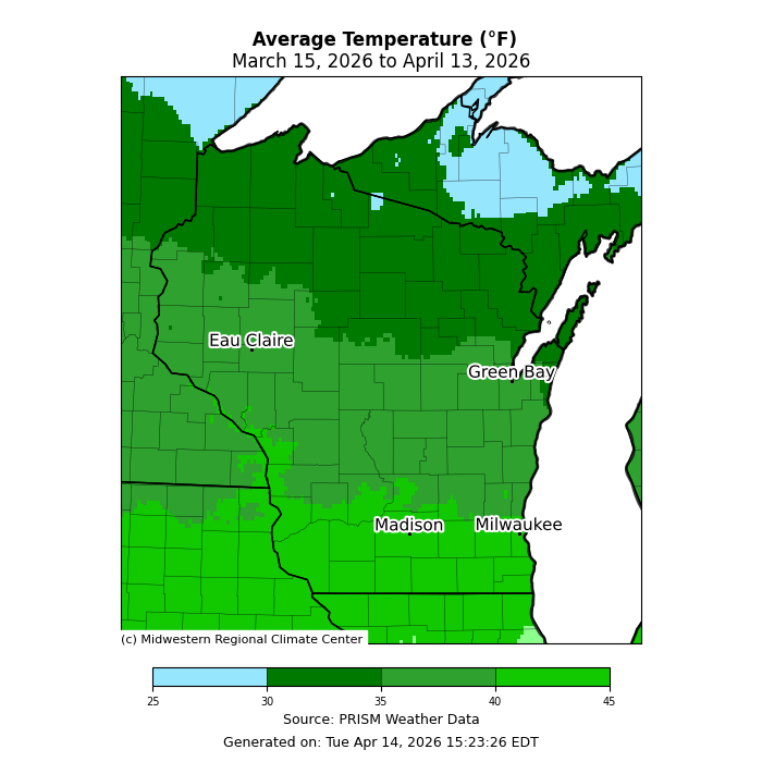 The map is titled “Average Temperature (°F), March 15, 2026 to April 13, 2026.” It shows Wisconsin shaded by 30‑day average temperature. A color scale at the bottom ranges from about 25 °F (light blue) to 45 °F (bright green). Northern Wisconsin, especially near Lake Superior, appears in darker green to blue‑green shades, indicating cooler averages around 30–35 °F. Central Wisconsin is medium green, around 35–40 °F. Southern Wisconsin, including areas near Madison and Milwaukee, is brighter green, indicating warmer averages near 40–45 °F. The source is PRISM Weather Data, with generation noted as April 14, 2026 by the Midwestern Regional Climate Center.
