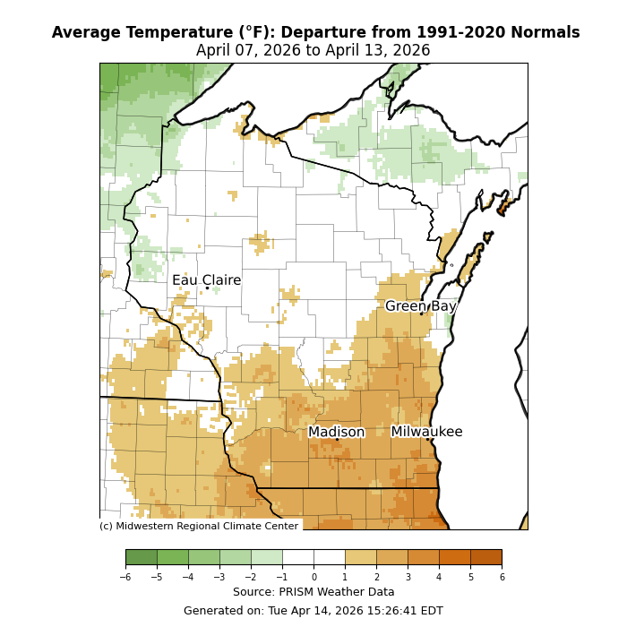 The map is titled “Average Temperature (°F): Departure from 1991–2020 Normals, April 07, 2026 to April 13, 2026.” It shows Wisconsin shaded by temperature departure from normal, using a color scale from about −6 °F (green) to +6 °F (brown). Northern Wisconsin appears mostly light to medium green, indicating cooler-than-normal conditions of roughly 2–5 °F below normal. Central Wisconsin is largely near white, indicating near‑normal temperatures. Southern and southeastern Wisconsin, including areas around Madison and Milwaukee, are shaded tan to light brown, indicating warmer-than-normal conditions of about 2–5 °F above normal. A legend at the bottom shows the numeric departure ranges. The source is PRISM Weather Data, generated April 14, 2026 by the Midwestern Regional Climate Center.