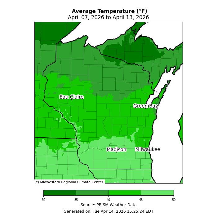 The map is titled “Average Temperature (°F), April 07, 2026 to April 13, 2026.” It shows Wisconsin shaded by average temperature, with a color scale from 30 to 50 °F. Darker green shades in northern Wisconsin indicate cooler averages near 30–35 °F. Central Wisconsin appears medium green, around 38–42 °F. Southern Wisconsin is lighter green, indicating warmer averages near 45–50 °F. A legend bar at the bottom shows temperature intervals, and text indicates the source as PRISM Weather Data, generated April 14, 2026 by the Midwestern Regional Climate Center.