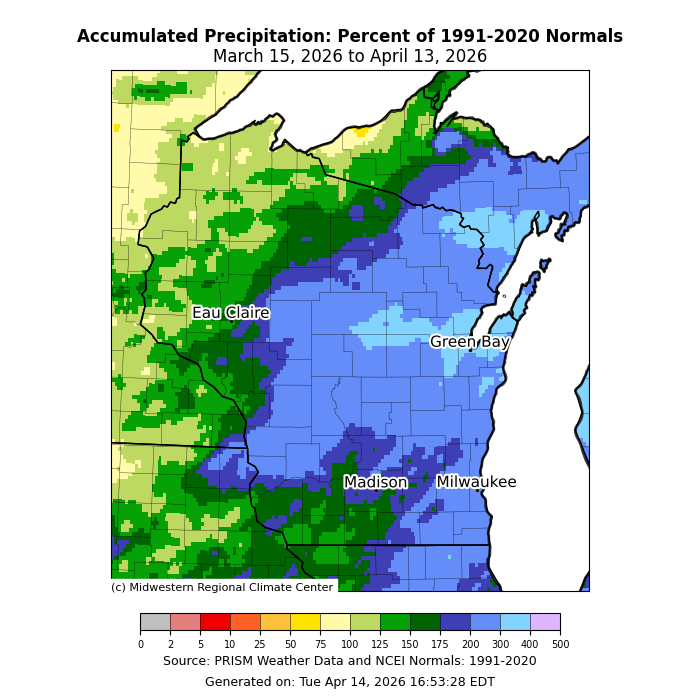 The map is titled “Accumulated Precipitation: Percent of 1991–2020 Normals, March 15, 2026 to April 13, 2026.” Colors indicate precipitation as a percentage of normal. Blues and light blues (about 50–100%) dominate central and eastern Wisconsin, including Green Bay, Madison, and Milwaukee, indicating below-normal precipitation. Greens (around 125–175%) appear mainly in western and northern Wisconsin, showing above-normal totals in those areas. A legend along the bottom ranges from near 0% to 500%. Credits include the Midwestern Regional Climate Center, PRISM Weather Data, and NCEI Normals (1991–2020), generated April 14, 2026.