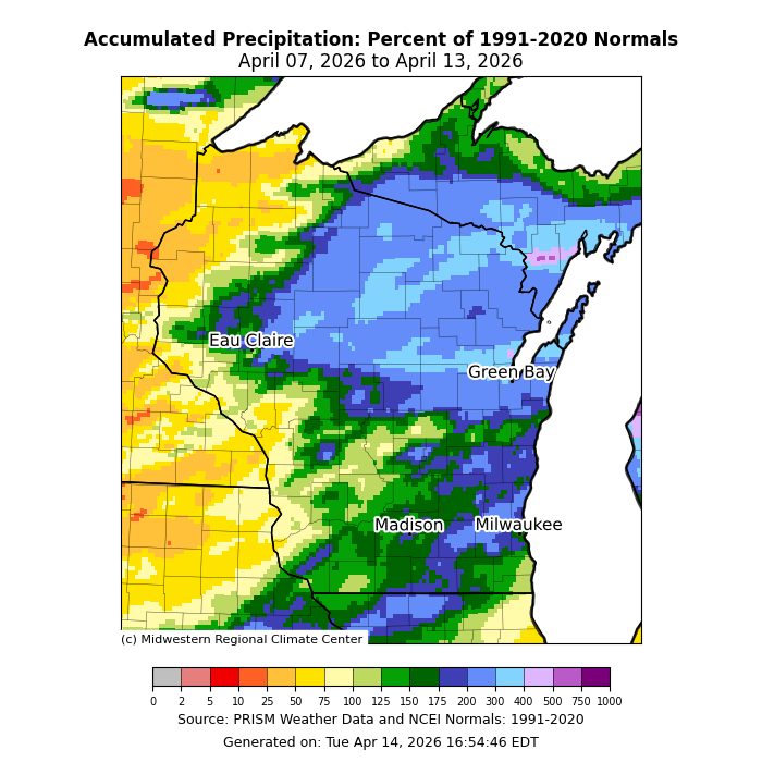 - A large portion of Wisconsin experienced precipitation totals that were 200-400% of average. Elsewhere, totals were at or above normal.