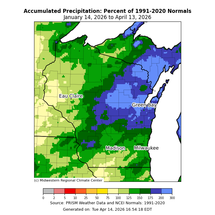The map is titled “Accumulated Precipitation: Percent of 1991–2020 Normals, January 14, 2026 to April 13, 2026.” Colors represent precipitation as a percentage of normal, ranging from near 0% to 300%+ per the legend. Central and eastern Wisconsin, including Green Bay, Madison, and Milwaukee, appear mostly in blue shades, indicating below-normal precipitation (roughly 50–100%). Western and northern Wisconsin show green shades, indicating near to above-normal precipitation (about 125–175%). Lighter yellow-green tones appear in parts of southwestern Wisconsin, indicating near-normal totals. The legend and credits note PRISM Weather Data and NCEI Normals (1991–2020), with the map generated April 14, 2026 by the Midwestern Regional Climate Center.