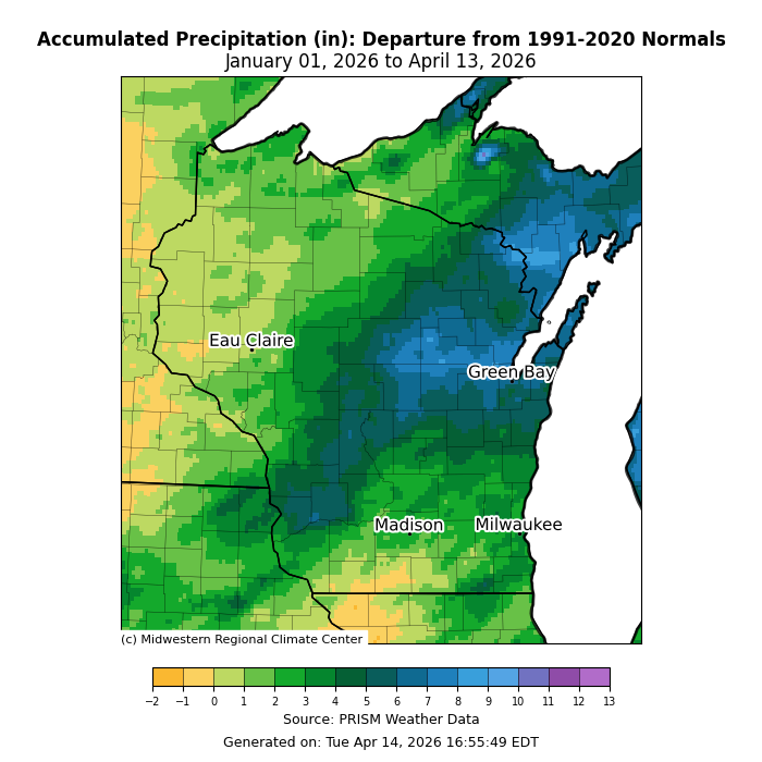 The map is titled “Accumulated Precipitation (in): Departure from 1991–2020 Normals, January 01, 2026 to April 13, 2026.” Colors represent inches above or below normal. Blues indicate below-normal precipitation, dominating central and eastern Wisconsin, including Green Bay, Madison, and Milwaukee, with departures roughly 1–4 inches below normal. Greens indicate near to moderately above-normal precipitation in much of western and northwestern Wisconsin, around 0 to 4 inches above normal. Yellow shades in parts of southwestern Wisconsin indicate slightly below-normal areas. A legend at the bottom ranges from −2 to +13 inches. Credits list the Midwestern Regional Climate Center, PRISM Weather Data, and generation date of April 14, 2026.