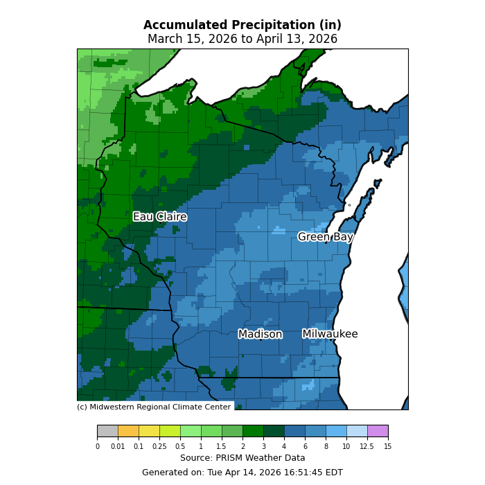 The map is titled “Accumulated Precipitation (in) March 15, 2026 to April 13, 2026.” A color scale indicates precipitation totals in inches, ranging from near 0 to 15+. Western and northern Wisconsin appear in darker green shades, representing higher totals (about 4–8+ inches). Central, eastern, and southern Wisconsin are shown mostly in blue tones, indicating lower totals (roughly 2–4 inches). The graphic credits the Midwestern Regional Climate Center and PRISM Weather Data, generated April 14, 2026.