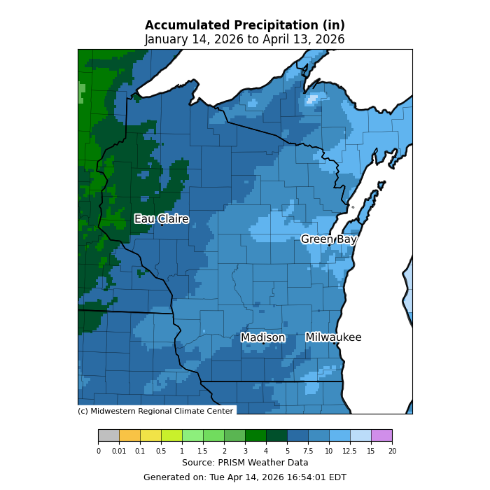 The map is titled “Accumulated Precipitation (in) January 14, 2026 to April 13, 2026.” Precipitation totals are represented by a color scale ranging from near 0 to about 20 inches. Most of Wisconsin appears in medium to darker blue shades, corresponding to roughly 4–8 inches of accumulated precipitation over the 90-day period. Portions of far western and northwestern Wisconsin show greener shades, indicating higher totals around 8–12 inches. The eastern and southeastern parts of the state, including Green Bay, Madison, and Milwaukee, show more uniform blue tones, indicating lower totals relative to the west. The map credits the Midwestern Regional Climate Center and PRISM Weather Data and notes it was generated on April 14, 2026.