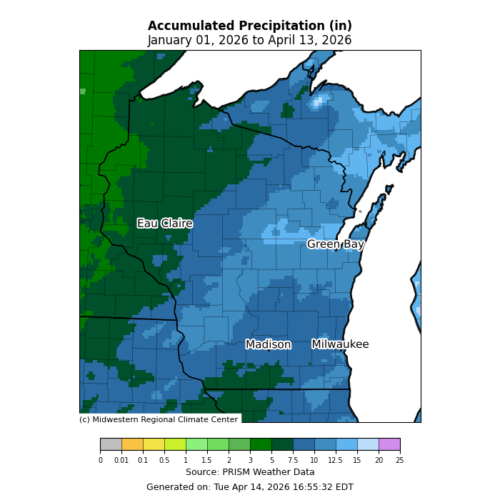 The map is titled “Accumulated Precipitation (in) January 01, 2026 to April 13, 2026.” Precipitation totals are shown using a color scale ranging from near 0 to 25 inches. Most of the state appears in blue shades, indicating roughly 5–10 inches of accumulated precipitation over this period. Western and northwestern Wisconsin show greener shades, indicating higher totals, approximately 10–15 inches. Central, eastern, and southeastern Wisconsin, including Green Bay, Madison, and Milwaukee, are dominated by blue tones, reflecting lower totals than the west. The bottom of the graphic credits the Midwestern Regional Climate Center and PRISM Weather Data and notes it was generated on April 14, 2026.