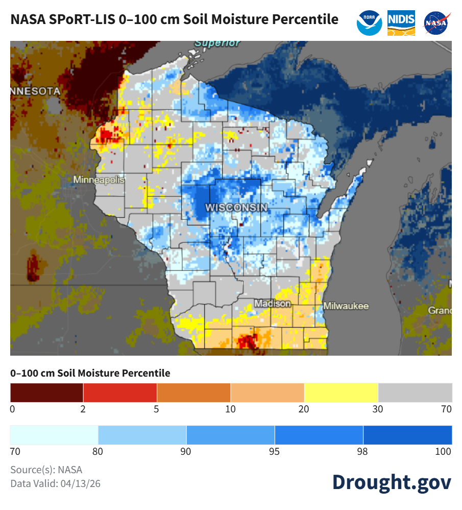 The map is titled “NASA SPoRT‑LIS 0–100 cm Soil Moisture Percentile” and covers Wisconsin and nearby regions. Colors represent soil moisture percentiles: dark red to orange indicates very dry soils (0–10th percentile), yellow shows below‑normal moisture (10–30th), light gray is near normal, and light to dark blue indicates above‑normal to very wet soils (70–100th percentile). Central Wisconsin is dominated by blues, indicating wetter‑than‑normal soil moisture. Northwestern Wisconsin and parts of southern Wisconsin show red and orange areas, indicating very dry conditions. The legend at the bottom shows percentile ranges from 0 to 100. Text below the legend reads “Source(s): NASA” and “Data Valid: 04/13/26,” and “Drought.gov” appears at bottom right. NASA, NOAA, and NIDIS logos appear at the top right.