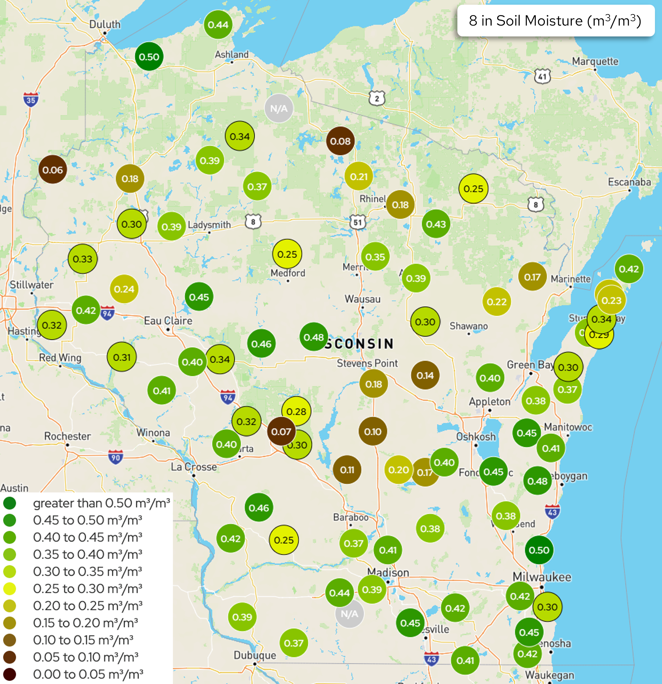 The image is a map of Wisconsin titled “8 in Soil Moisture (m³/m³).” Circular station markers are distributed across the state, each labeled with a numeric soil moisture value at 8 inches depth. Marker colors correspond to moisture ranges shown in a legend at lower left: dark red and brown indicate very low moisture (0.00–0.10 m³/m³), yellow indicates low to moderate moisture (0.20–0.30), light green shows moderate moisture (0.30–0.40), and dark green indicates high moisture (0.40–greater than 0.50). Soil moisture values vary across the state. Several south‑central locations show low values around 0.07–0.14, while many central, western, and eastern stations show moderate to high values around 0.35–0.48.