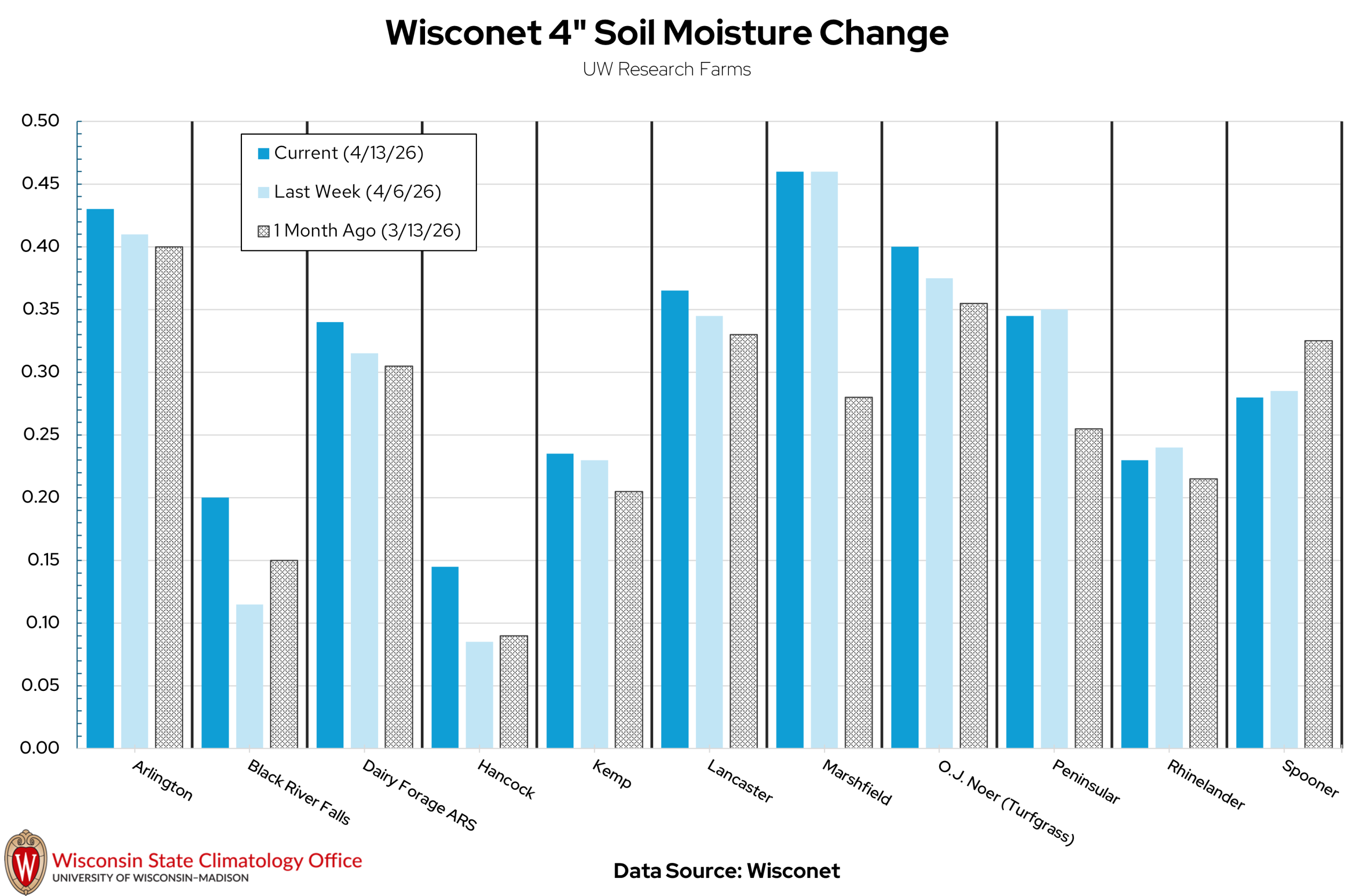 The chart is titled “Wisconet 4″ Soil Moisture Change” with a subtitle “UW Research Farms.” It displays grouped vertical bars for multiple locations along the horizontal axis, including Arlington, Black River Falls, Dairy Forage ARS, Hancock, Kewaunee, Lancaster, Marshfield, O.J. Noer (Turfgrass), Peninsula, Rhinelander, and Spooner. The vertical axis ranges from 0.00 to 0.50 (m³/m³). Each location has three bars: dark blue labeled “Current (4/13/26),” light blue labeled “Last Week (4/6/26),” and gray labeled “1 Month Ago (3/13/26).” Most sites show current soil moisture between about 0.20 and 0.45, with higher values at Marshfield and Arlington and lower values at Hancock and Peninsula. A legend appears near the top left. At the bottom left is the Wisconsin State Climatology Office logo, and centered text reads “Data Source: Wisconet.”