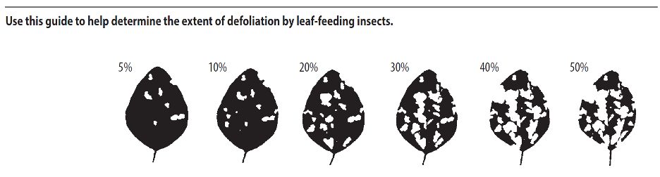 Symptoms of soybean defoliators are irregular holes in leaves, lacing, and feeding on leaf margins. Scout for defoliation over the entire plant and determine the percent defoliation per plant (Figure 5). If you only look at the upper canopy, you may overestimate the extent of defoliation.