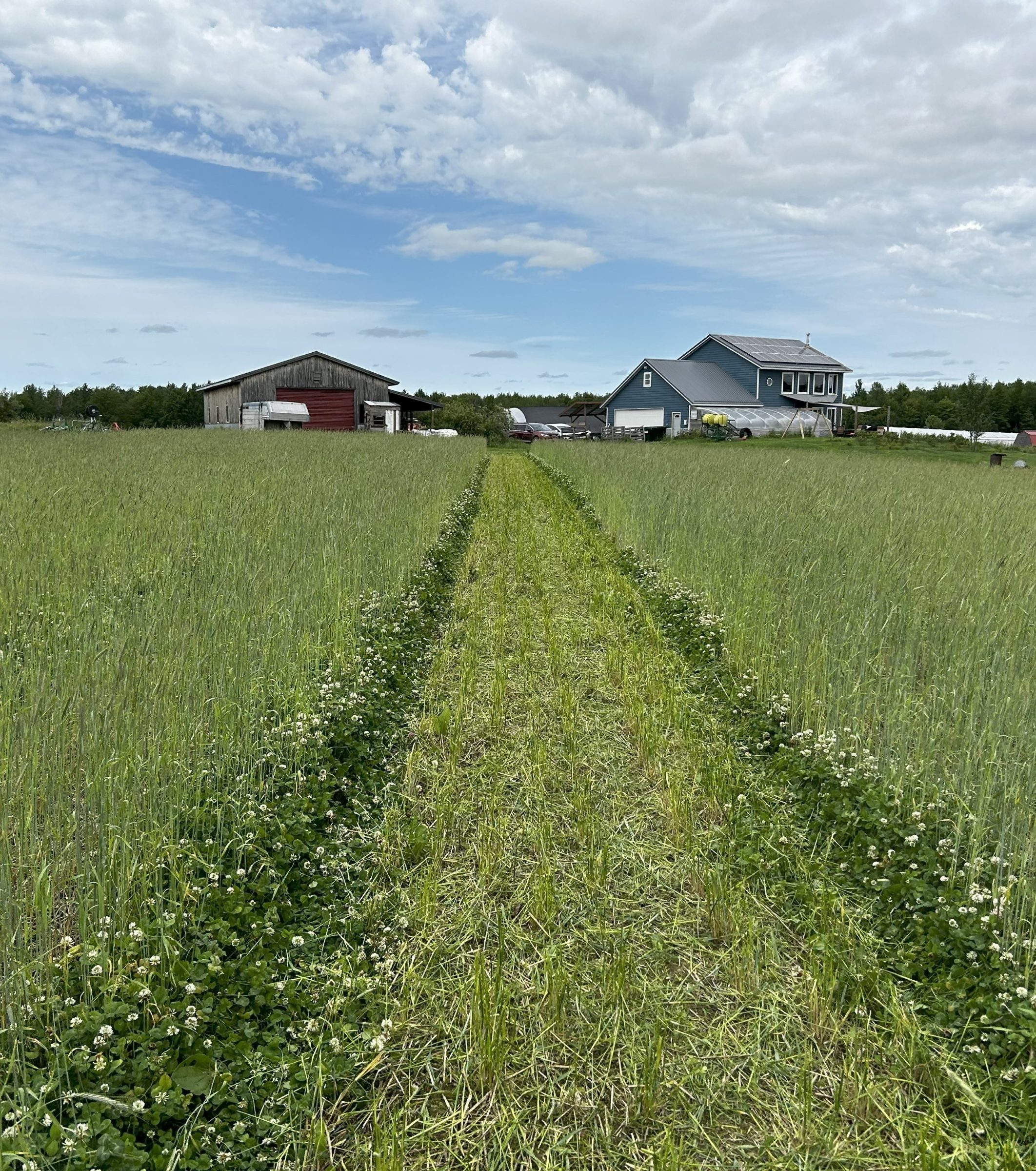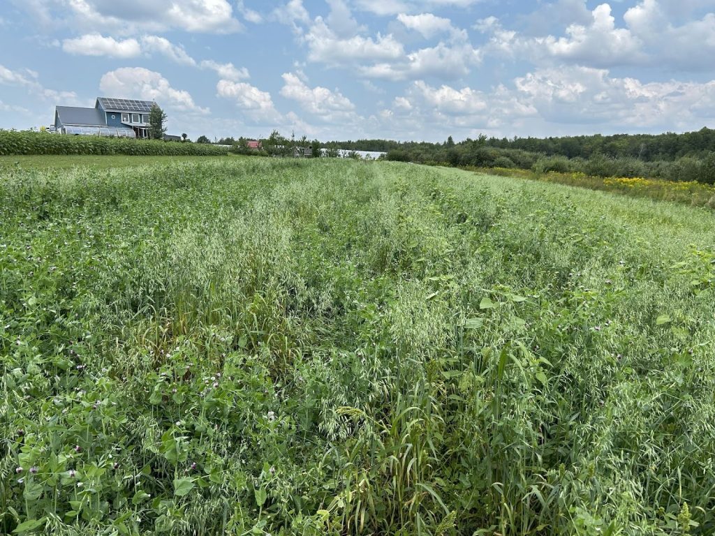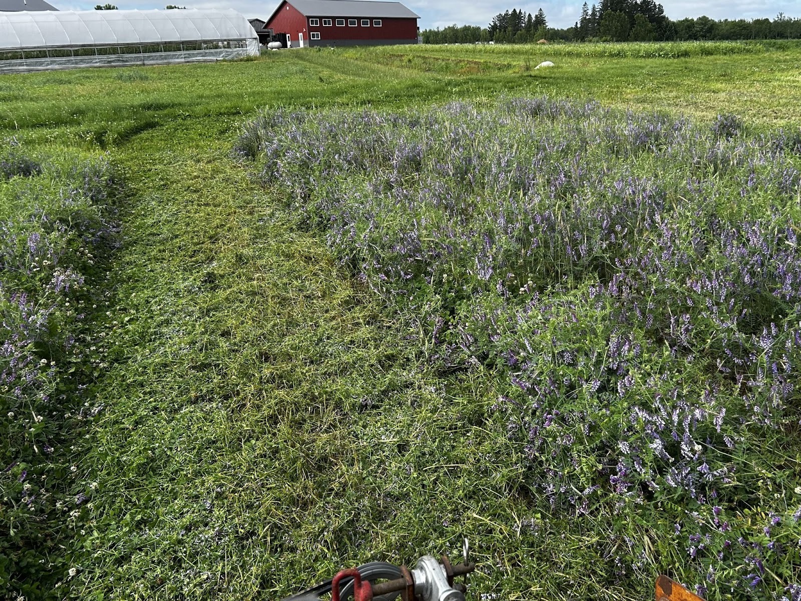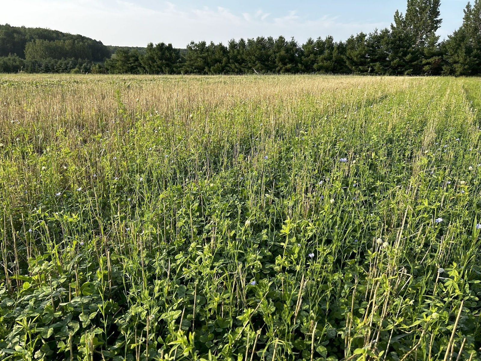 Figure 15. Clovers and blooming flax dominate as the rye is overwhelmed. This field is ready to be mowed and turned in for the midsummer reset.