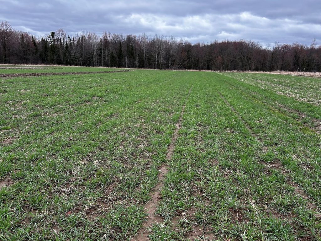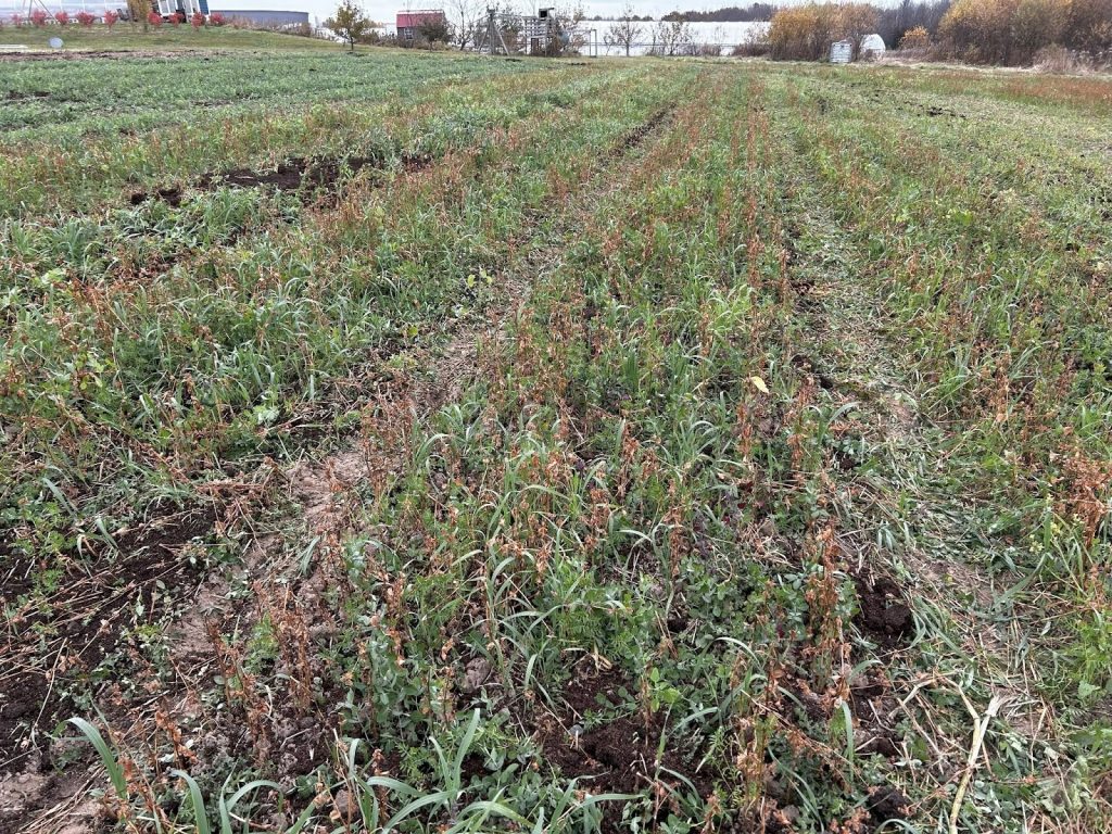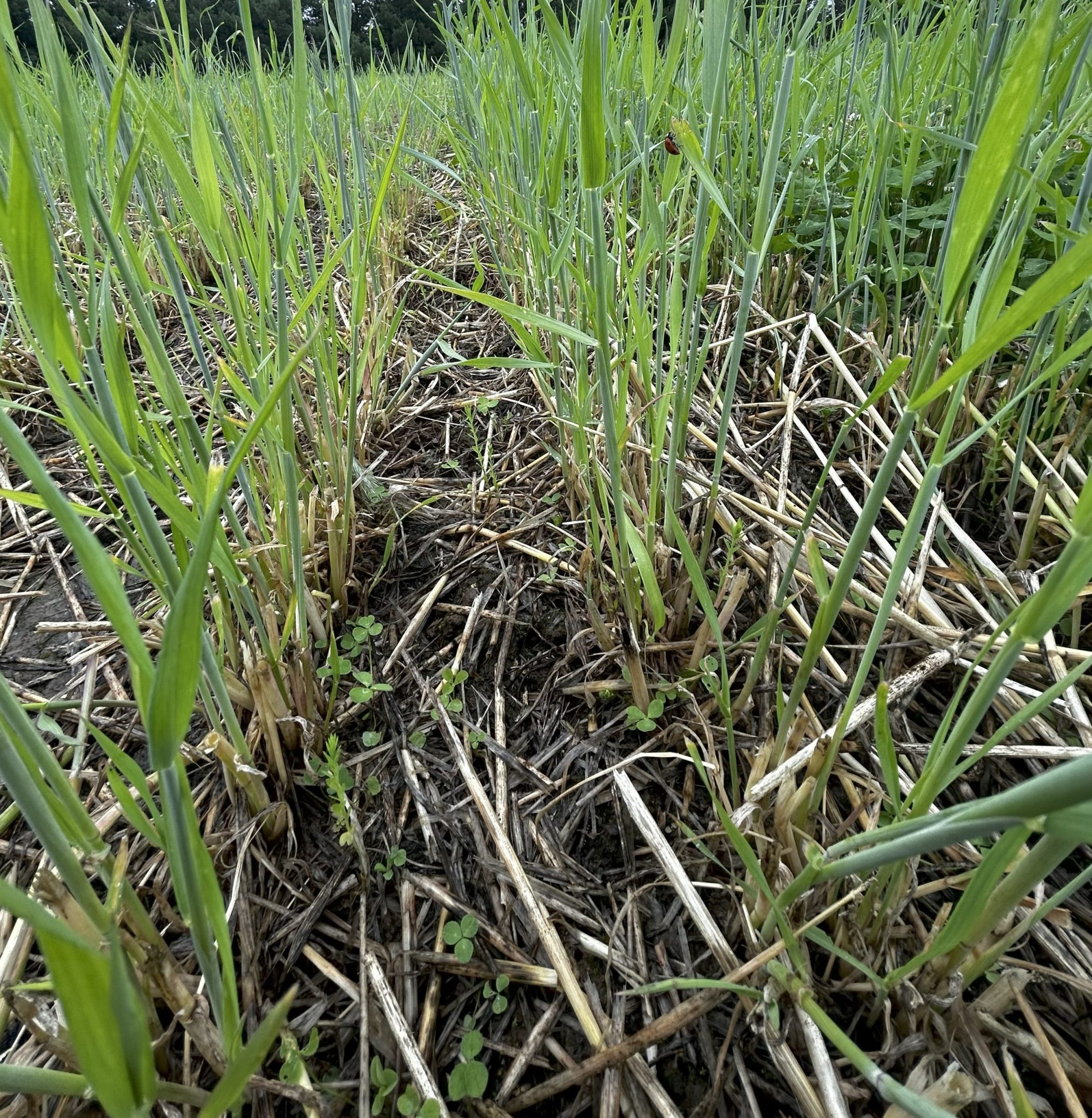 Figure 11. Winter rye emerging through winter killed oats, peas and buckwheat in early spring, after frost seeding berseem and balansa clover and flax.