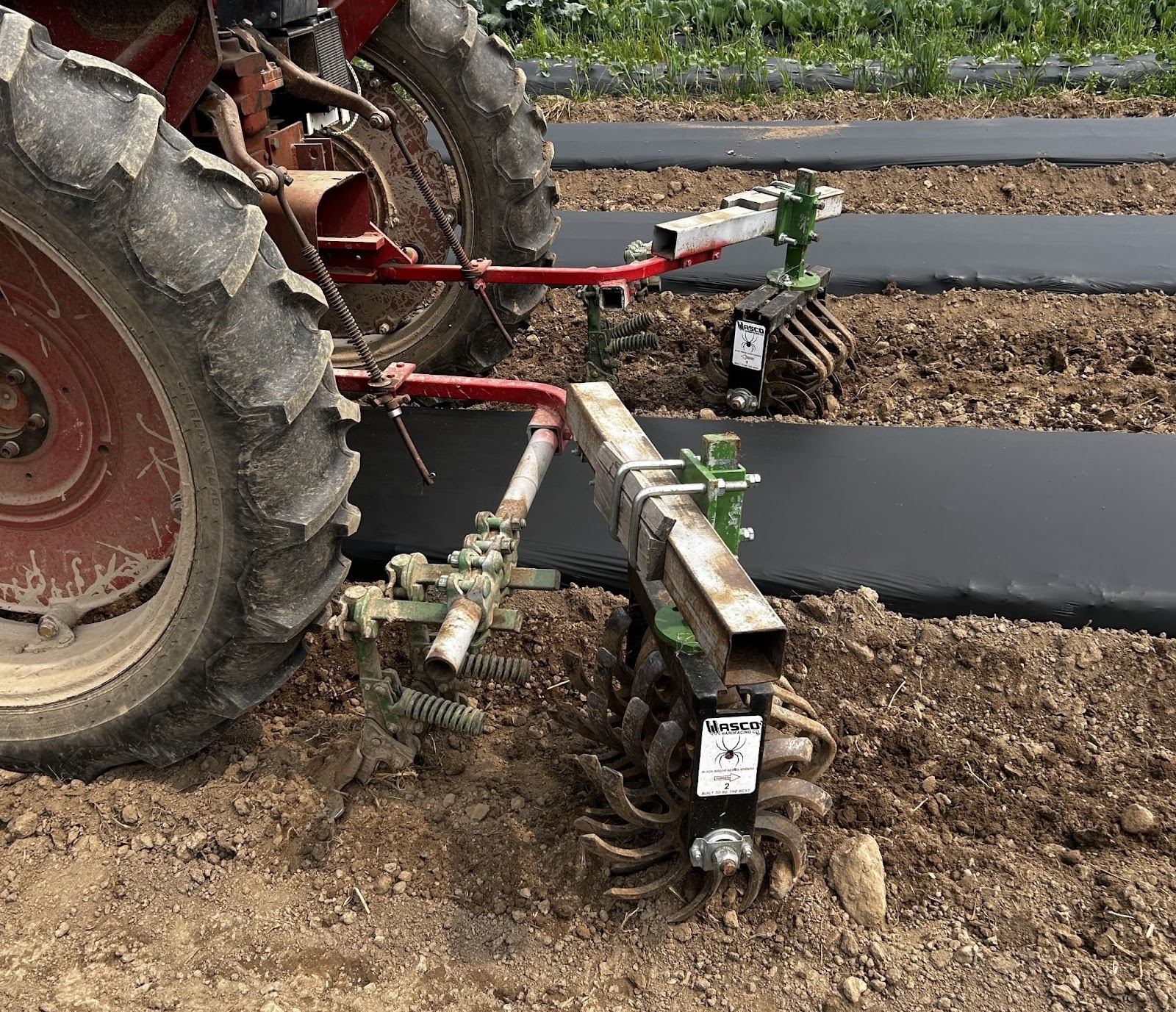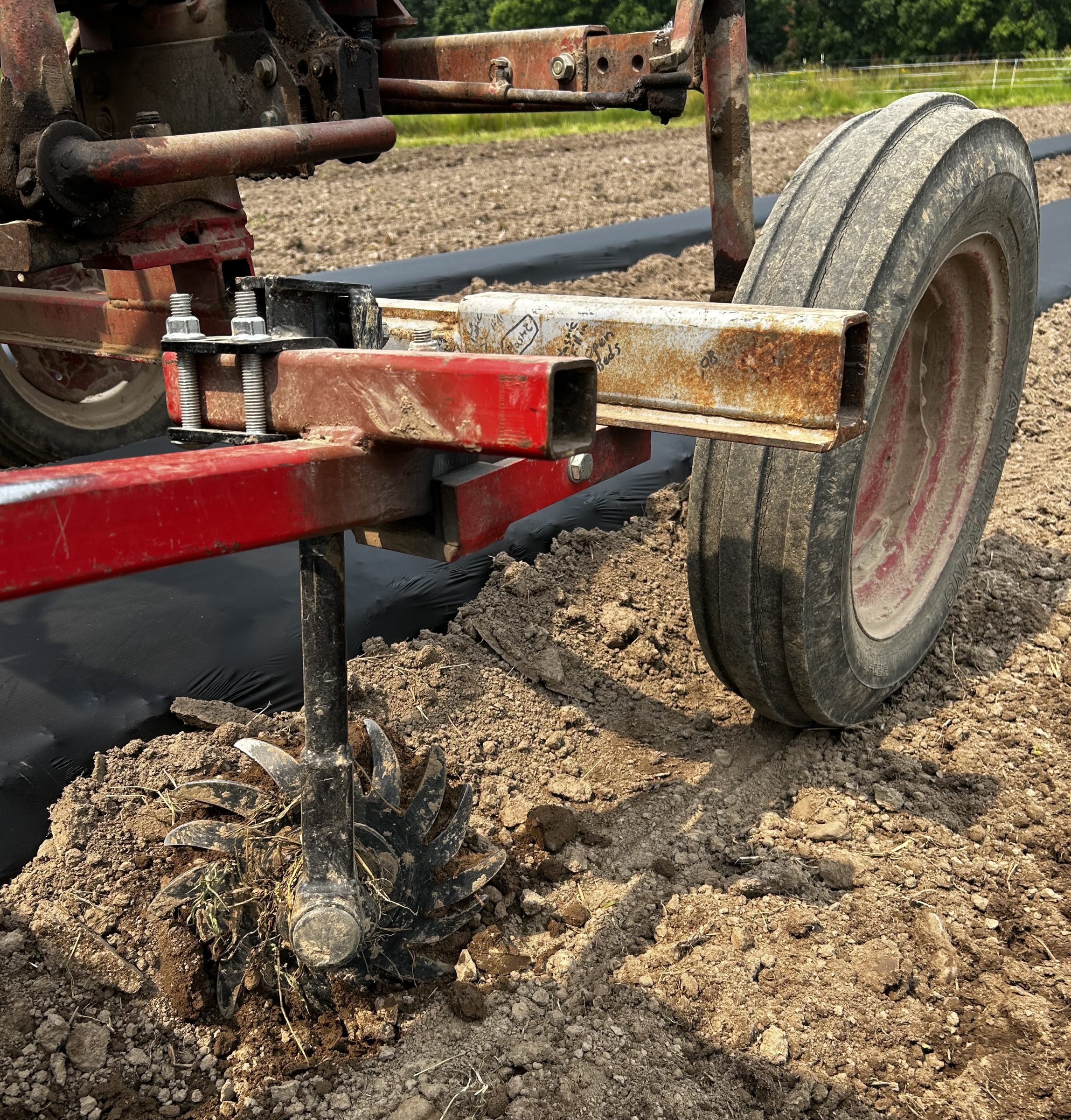 Tenzin cultivates 36” raised beds with 32” aisles, a width he achieves by driving the tractor just outside the wheel track on the last pass while laying the plastic. This setup is less intensive than many other farms, with nearly half of the field dedicated to living aisles. After laying the plastic, he uses a cultivating tractor to level the aisles and create a fine seedbed (Figure 2). This step is crucial for ensuring the system functions well. The tractor is equipped with belly-mounted spider hoes to smooth the bed edges and rolling basket cultivators to flatten out the compacted ridge in the middle of the aisles caused by the bedder-layer (Figure 3 and Figure 4). The result is a flatter, looser surface that enhances seed-to-soil contact, promoting better germination. Once the living aisles are established, the flatter surface makes it easier to mow.