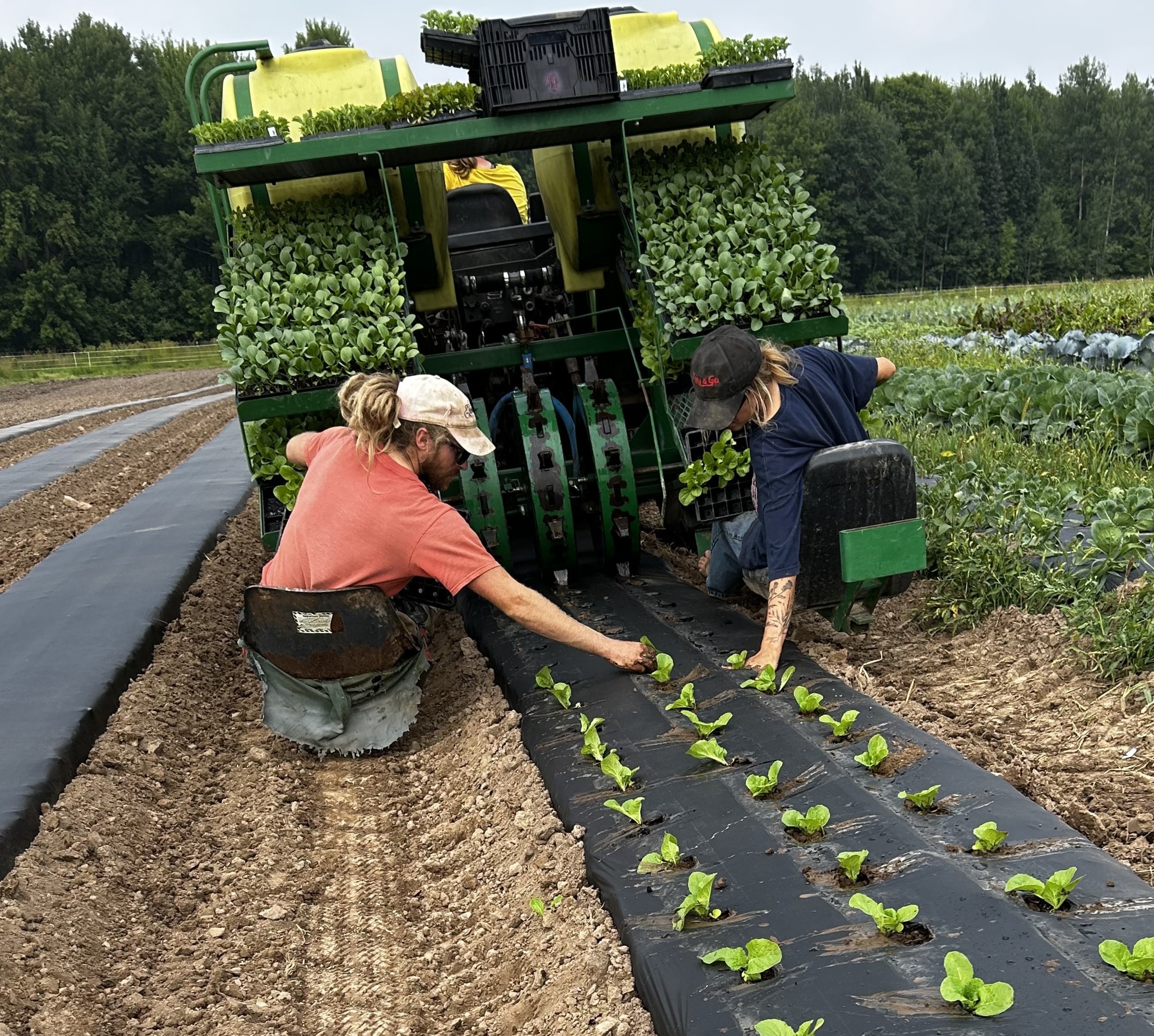 Figure 6. Transplanting lettuce with a waterwheel transplanter. The wheel traffic helps work the cover crop seeds into the soil.