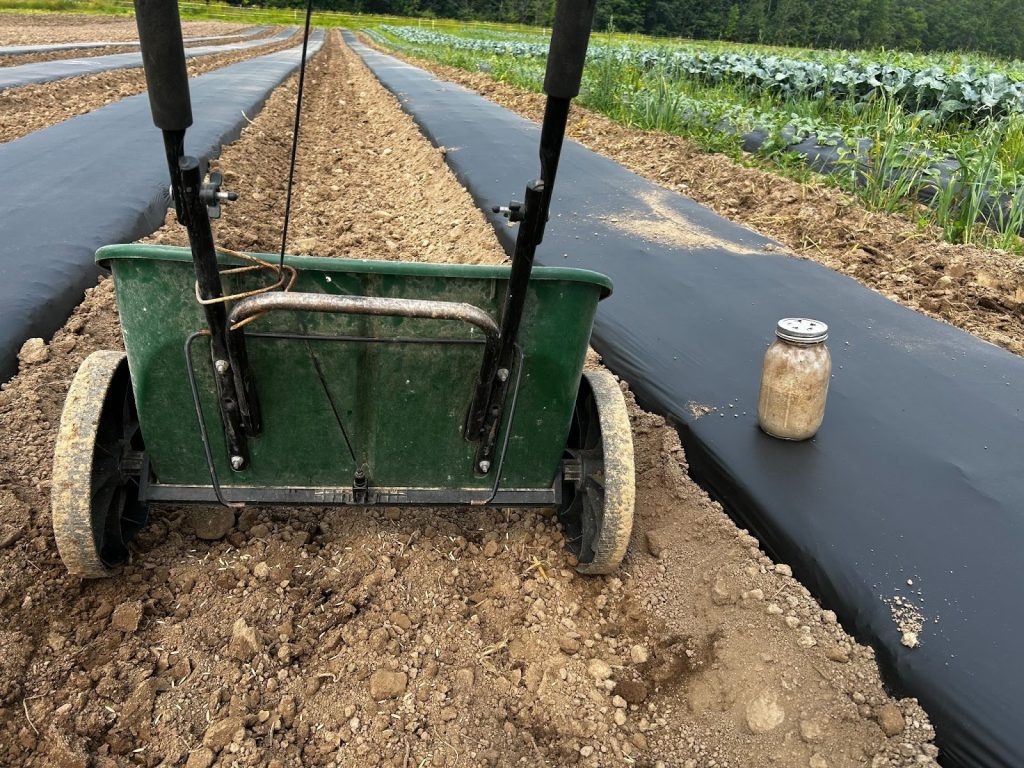 Tenzin then seeds the aisles using a drop spreader, using a base mix of oats, millet, and Dutch White clover (Figure 5). Before seeding, he mixes the oats with compost extract to slightly moisten them, with the goal of introducing beneficial microbes. Next, he adds millet and a portion of the Dutch White clover. He also incorporates a bit of clay – either soft rock phosphate or azomite – into the mixture. The clay helps the clover seeds stick to the oats, ensuring more even distribution. Without this step, the tiny clover seeds tend to sift through the mixture and drop out of the seeder too quickly. To further refine the process, Tenzin also makes a shaker from a ball jar with holes poked in the lid. He fills it with Dutch White clover seed and shakes it into the drop seeder while walking, ensuring more uniform coverage throughout the aisles.