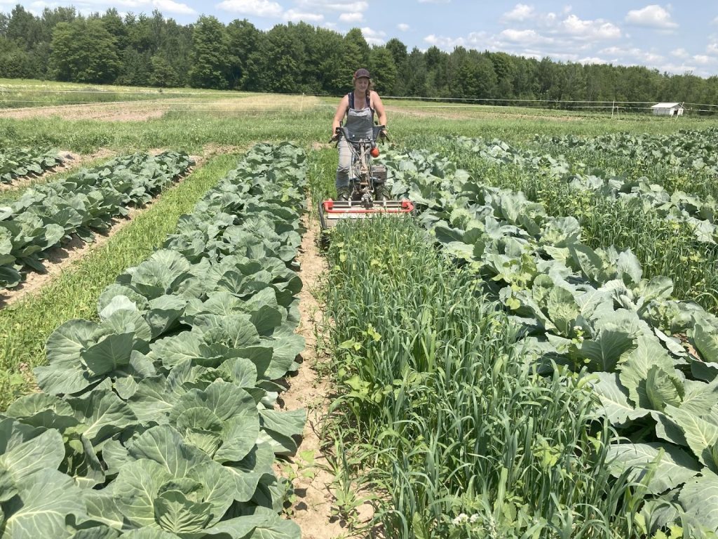 About 10-14 days after transplanting, Tenzin cultivates the bed shoulders with spider hoes on his cultivating tractor to ensure smooth, weed-free bed edges (Figure 7). As the cover crops grow and the oats start to show signs of heading out, he mows the aisles with a BCS flail mower (Figure 8 and Figure 9). He aims to wait until the oats and weeds are flowering, which helps to set them back more effectively. If he times it right, he can get by with just one mowing for certain crops. However, he will often need to mow 2-3 times before the cash crops start to spill into the aisles and impede the mower. While the oats and millet rebound after mowing, they are weakened and typically grow shorter and set fewer viable seeds. After the last mowing, the clover is usually well established beneath the oats and millet and ready to take off, filling in the aisles nicely as the season progresses.