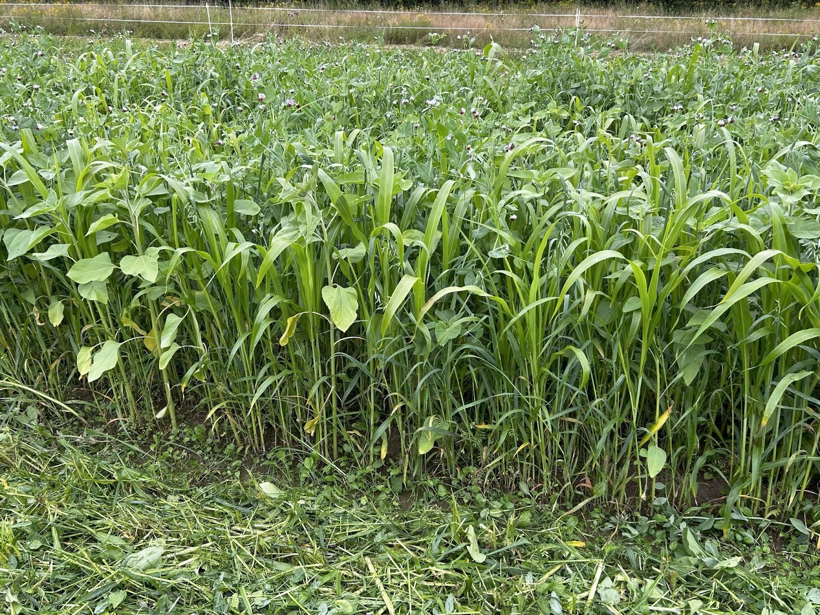 The combination of oats and millet in the mix serves as a sort of “insurance policy” for Tenzin – if the weather is cool and wet, the oats thrive, while in hot and dry conditions, the millet will do better. Typically, both crops will grow, though one often outperforms the other. The oats also germinate quickly and serve as a nurse crop for the clover.
