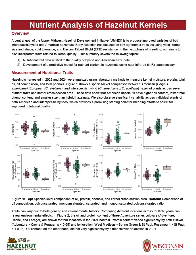 In the United States, current hazelnut production is limited almost exclusively to the Willamette Valley of Oregon where there is roughly 80,000 acres of production, more than half of which has been planted in the last five years in response to growing global demand for hazelnuts. There has been an active breeding program in Oregon with a number of high quality cultivar releases. Though early adopter growers in the Upper Midwest have tried growing these cultivars in the Upper Midwest, they are not sufficiently well adapted to our region to support commercial production. First, they are not winter hardy and growers that have tried them regularly experience dieback from cold injury. Second, they are not sufficiently resistant to Eastern Filbert Blight, a fungus that is endemic to the Upper Midwest and is lethal to susceptible genotypes.