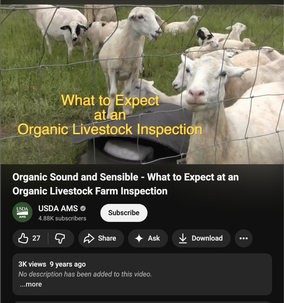 A video explaining the process of organic inspection on livestock farms, including details about inputs, feed, shelter, working through non-compliance, and the cost of certification.