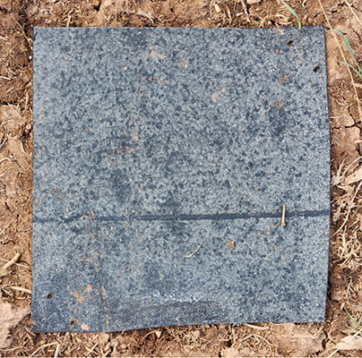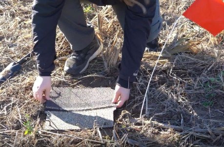 Lift the shingle and flip it over so the dark side is facing up. Count all the slugs on the shingle and on the soil surface in the shingle’s “footprint” (area of bare soil revealed when the shingle is lifted).